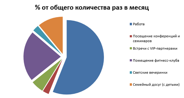 1. После этого рисуем круг (круговую диаграмму), в который вносим сегменты вашей жизни, для которых нужны определенные стили одежды. После такой экспресс-диагностики, вам станет понятно, что, например, большая часть вашей жизни проходит на работе, периодически вы участвуете во встречах с очень важными партнерами (где ваш гардероб должен быть безупречен), вам необходима спортивная одежда для посещения фитнесс-клуба, модная/вечерняя одежда для светских тусовок и спокойная casual одежда для семейного досуга.